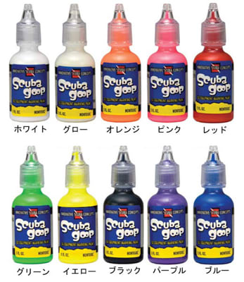 おしゃれ小物☆スキューバGOOP 器材/キャンペーン 2013.01.20 「器材を間違えられてしまった、 紛失してしまった」 ・・・なんていう経験がある方! もっとオリジナリティを出したい! そういう方にオススメなのが、 このスキューバGOOP ¥1.365- 素材を選ばずに、豊富なカラーで思いのままのデザインでお絵かき可能!! 収縮可能な3Dインクなので、 ゴム製品やプラスチック、金属、陶器、布製品など、 収縮するTシャツやウェットスーツから、 BC、ブーツ、グローブ、マスクなどなど、 何でもOKです!