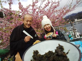 只今田子にてランチタイムです!ダイビングセンターには満開の桜が咲いております!サービスでいただいた貝汁はフジツボやカメノテ、マキガイやら貝がごったがえしてダシがめっちゃでてマイウー!サザエみたいにおいしい貝が混ざってます!