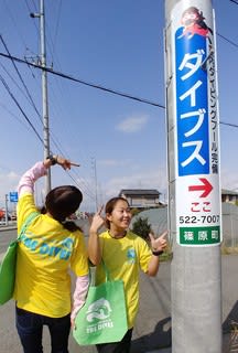 曲がり角の電柱に、案内の看板を取り付けましたので