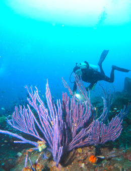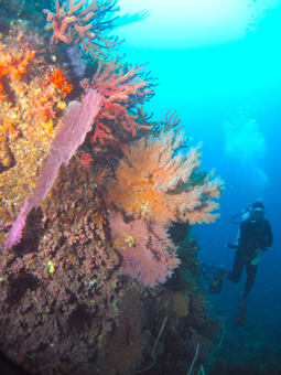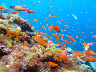 水中は、水深12~25mほどで起伏が緩やかなので初心者の方から楽しむことができます。手つかずのソフトコーラルが広がっていてキンギョハナダイの群れがいつも見られます。