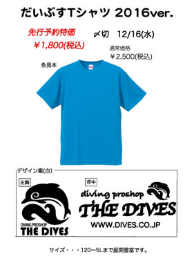 だいぶすTシャツ2016年ver. 注文受付開始! weblog 2015.12.10 来年のダイブスTシャツの色が決定しました! ターコイズカラーに白のロゴが入ります。 生地は速乾性に優れたドライ仕様なので、汗をかいてもサラサラ&着心地も抜群 12/16(水)までにご注文いただくと、通常価格¥2,500が、¥1,800に! しかも!先行予約なら、サイズも選べちゃいます!! サイズ展開は、120~5Lまでの12サイズ。ご家族で揃えちゃうのもアリかも~ サイズ等、詳細はお気軽にお問い合わせ下さいませ ご予約もお待ちしておりま~す