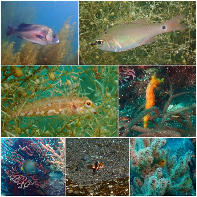 湾内はホンダワラやミルが多く、外海はカギケノリの絨毯とまだまだ海藻が楽しいです。そこに隠れたり寄り添う魚たち。