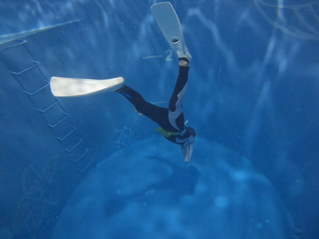 体をまっすぐに伸ばし、蹴り込みのタイミングを合わせることで、少ない力でスッと潜れるようになってきました。