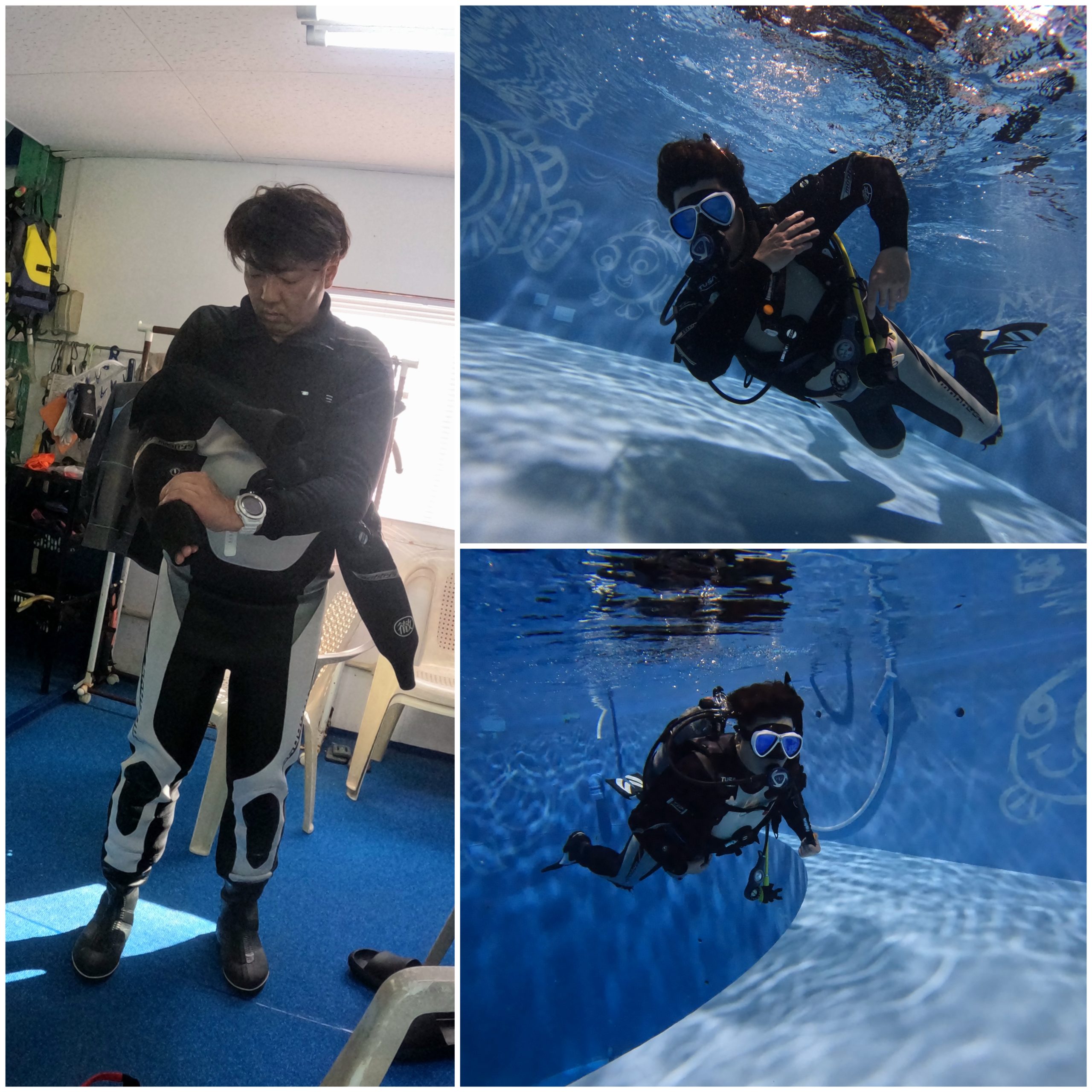 そのあとは、ビーチの浅場をイメージしてドライスーツの給排気の確認、足先に残った空気をしっかり抜く練習も行いました。