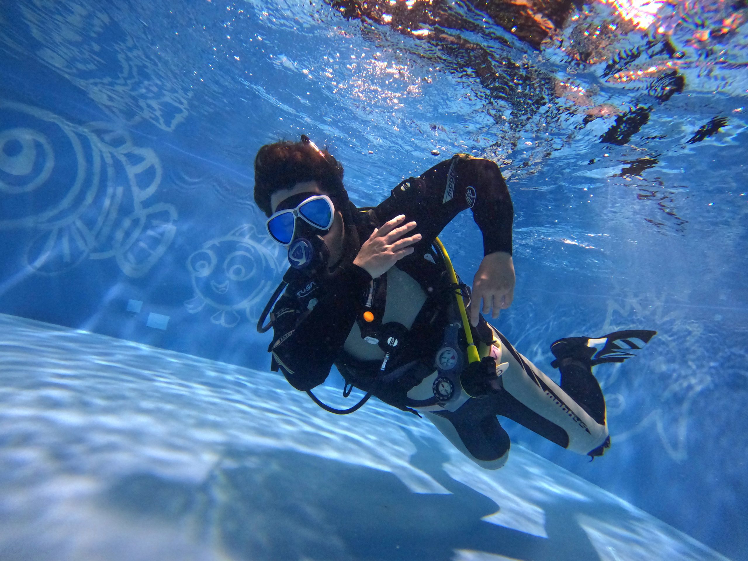 さらに、プール側面のヒトデを目印にして浮力コントロールと姿勢の特訓!