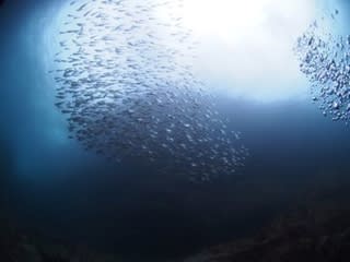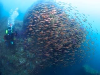 『キンメモドキはどこだ〜〜〜!!!』とウロウロしていたらハタンポ玉やクロホシイシモチの群れ発見です。