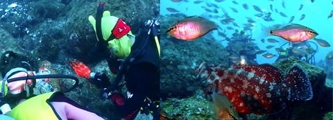 3匹がキンメモドキやクロホシイシモチの群れの間と、お二人の間をグルグル!近〜い