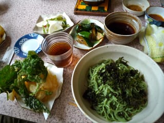 ここは、どのメニューにも明日葉とタマネギのかき揚げが付いていて、