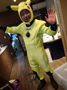 嬉しくて!! 器材/キャンペーン 2013.06.08 myドライスーツを作られたカトちゃん 浜名湖クリーンから戻った後に、ノリノリで思わず試着会をして、 みんなで盛り上がってしまいました!! ピカチュウとってもお似合いで~す
