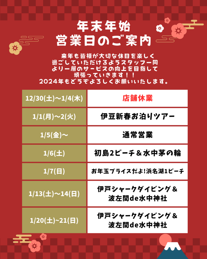 年末年始の営業のお知らせ weblog 2023.12.28 直前で大変申し訳ございません。お問い合わせ、ご予約お待ちしております。店舗休業中、電話は転送をかけております。出られなかった場合はおかけ直しいたします