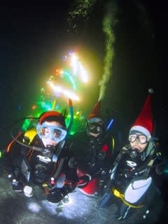 名物の水中ツリーはピカピカ光るイルミネーション付き!