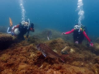 水中からバシバシと撮影もしていただき、緊張もちょっぴり和らぎ、体験チームもマダイに遊んでもらうことが出来ました