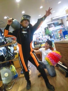 海猿カラーで出動!? weblog 2012.07.22 長年愛用されていたドライスーツがとうとう寿命のため新品海猿カラーに新調です!! せっかくなので出動体制で記念撮影です汗だくでタンクを背負っております。 初使用は秋以降のご予定!楽しみですね~~~♪