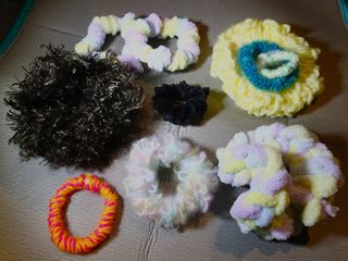 色々な種類の毛糸を使い、今回はゴムを飾った”シュシュ”を2つの方法で作成。