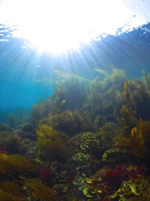 水槽でダンゴ観察をしたらいざエントリー。ビーチは海藻ダイビングも見所です!潜行すると目の前にホンダワラの草原。光が差し込んでとっても幻想的です♪
