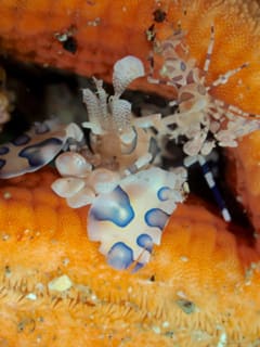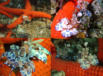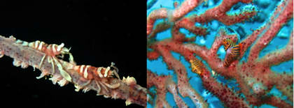 ムチカラマツにつくムチカラマツエビのペア。トラ柄のトラフケボリ。