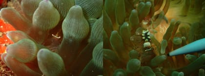 サンゴイソギンチャクを覗くとノソノソ動くエビがいる~♪カザリイソギンチャクエビやイソギンチャクエビなどかなりの確率で見られます。