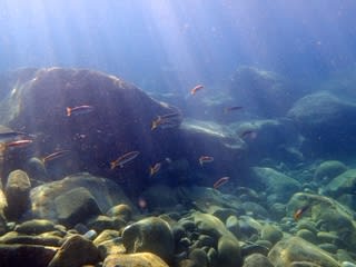 只今黄金崎では、ゴロタの上にイサキやタカサゴ、ウメイロモドキ、アカカマス、