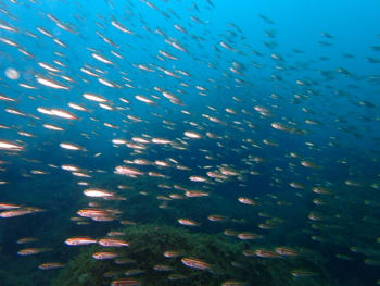 カンパチに追いかけられて逃げ惑うイサキの子供が川のように群れていました