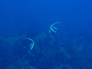 ゴロタ上を泳いでいると、ツノダシ(左)とハタタテダイ(右)が!画像が粗いですが、並んでいると違いが分かりやすいですね。