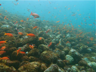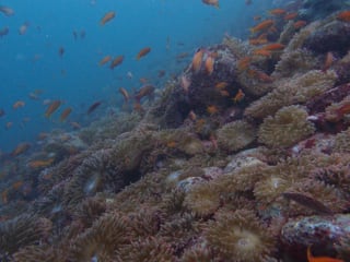 浅場では、キンギョハナダイとソラスズメダイがもの凄い数で群れていて、