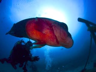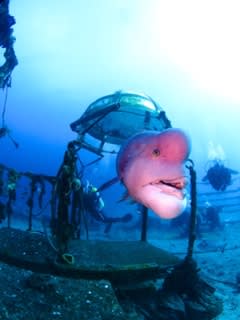 メインポイントの『高根』では、名物の頼子を筆頭に大きなコブダイ達がたくさんいます。大鳥居や海底神社、中にダイバーが入れるエアドームもあっておもしろーーーい!!フリソデエビのペアも見られました。