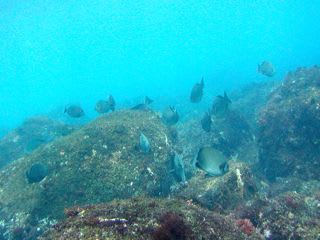 エントリーしてすぐの浅場には、ニザダイやアイゴ、メジナなどが群れて、追いかけっこしているかのように移動していました。