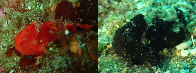 まずはケーソンの壁に逆さまについたオレンジのイロカエルアンコウ。砂地にいた黒バージョンはちょうど目の位置にハレーションが