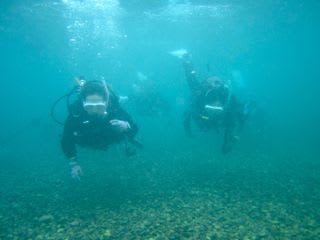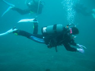 初講習のマユミさんは、ドライも初!!まずは着方と、吸排気を陸上にて練習し、水中では、BCを使って、中性浮力の練習です