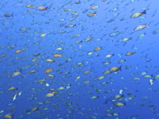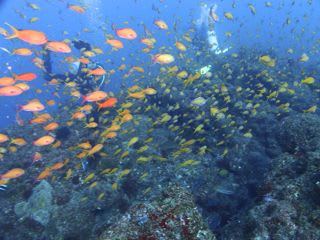 タカベやイサキ、サクラダイもいるのですが、キンギョハナダイの壁に埋もれ目を離すと見失うほど。