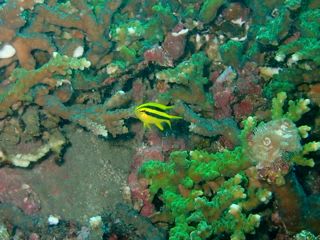 ミドリイシサンゴのところでは、トノサマダイの幼魚ちらちら。コブダイの幼魚、ヒレナガスズメダイの幼魚など、カラフルな幼魚達が見え隠れしていました。