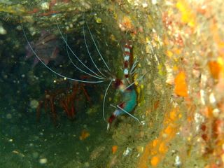 入ってすぐの土管には、卵を抱えたオトヒメエビが隠れていました。写真を確認すると、その更に奥にイセエビも隠れてたー