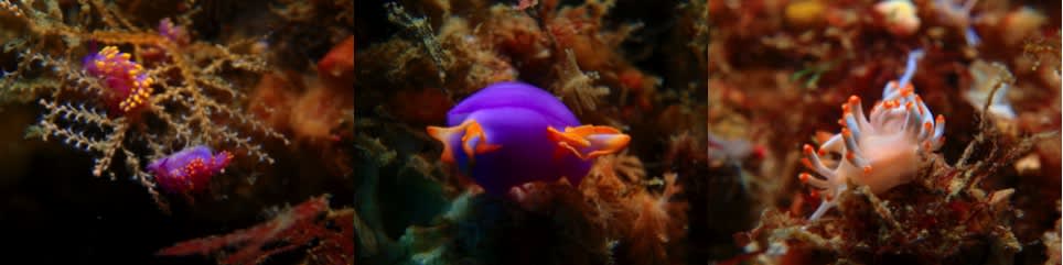 壁には、ミチヨミノウミウシ・ムラサキウミコチョウ・サキシマミノウミウシ。ナンヨウイボヤギには、サンゴガニの仲間達が隠れています。