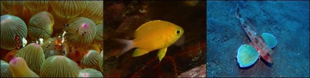 カザリイソギンチャクには至る所でクマノミやミツボシクロスズメダイがおり、高確率でイソギンチャクエビも見られました。
