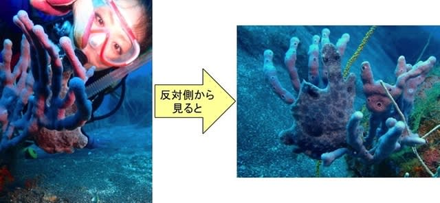 なかなかのサイズのオオモンカエルアンコウは、今にもカイメンから落ちそうなところに。