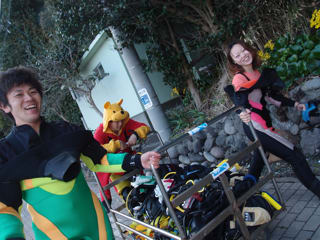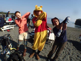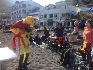 なんとプーさんカラーの新調ドライスーツのインナーにプーさんの着ぐるみで登場のショーヘイ君です!!!