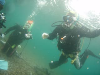 天気は快晴ではないですが、気温が高くドライスーツでいると陸上では少し暑い感じでした。水中は透明度8m水温21℃と水中は寒いので、インナーは保温性のある専用のものを使用されるのがオススメです!お持ちでない方はスタッフまでご相談ください。