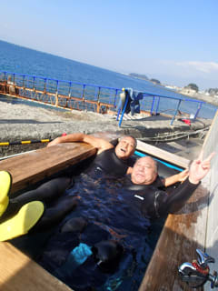 ワイルドダイバー松井さんにご紹介で、ライセンス取得コースを受講頂いた田中さんです。フルオーダーのウエットスーツで寒さも平気な元気いっぱいのお二人です