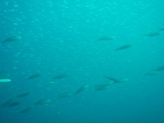 ツリーの上方を見上げると、メアジの群れの上に、逆走するキビナゴの群れが見られました。