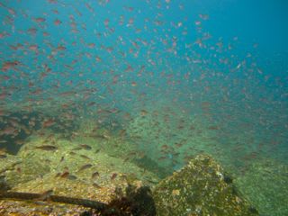 ゴロタでは、アカカマス、イシダイ、メジナ、ソラスズメダイ、フウライチョウチョウウオ、