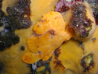擬態上手なイロカエルアンコウは、岩についた黄色い海綿の上でじっとしていました。