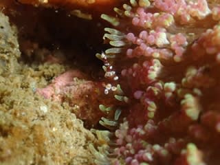 絨毯のサンゴイソギンチャクだけでなく、グビジンイソギンチャクなども転々とあるので、覗くとイソギンチャクモエビがフリフリ動いています
