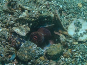 砂地の巣穴からタコがこちらを覗いています。