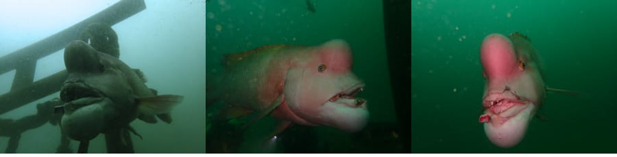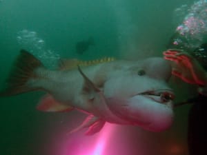 ハンマーをたたくと寄ってくる人懐こいコブダイですので、