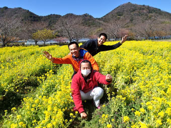 補足情報:この時期伊豆では、まだ菜の花が満開です。あちこちで菜の花畑が見られます。道中も春の景色が堪能でき、おトクな季節です。写真はだいぶすマルコメ軍団の皆さんです