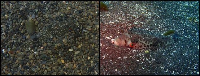 フィンを履いている時に足元をよく見るとクサフグが潜ってる?! 右は砂地に潜るヒガンフグ。