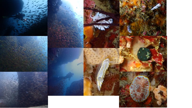 また洞窟内の壁には、アオウミウシやコミドリリュウグウウミウシ、サクラミノウミウシ、