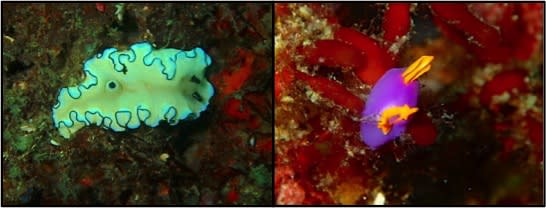 岩肌には、キイロウミウシのすぐ側に1/10サイズ??のムラサキウミコチョウなども見られました。