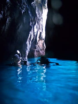 気温20℃ 水温20℃ 透明度10~15m!!さらに波無しウネリ無しのグッドコンディションだったので久々に黄金崎ホールへ洞窟ダイビングに行っちゃいました!水面からの色が凄くキレイでまさに青の洞窟です!