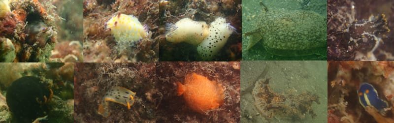 シロウミウシ・アオウミウシ(極小)・ダイダイウミウシ・クロシタナシウミウシ・